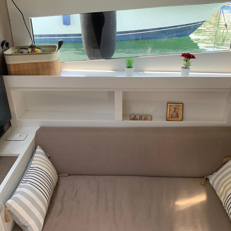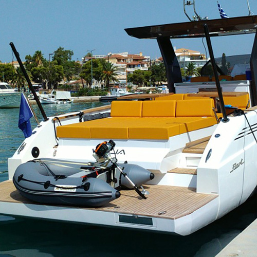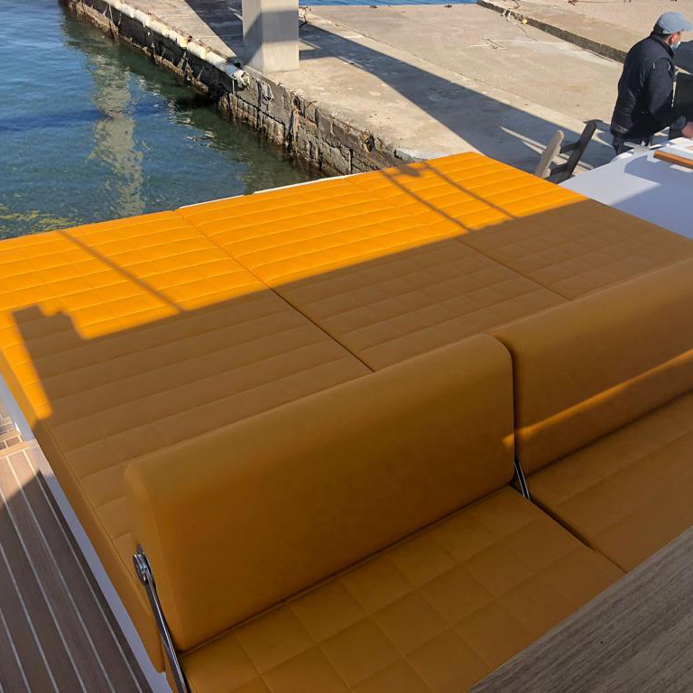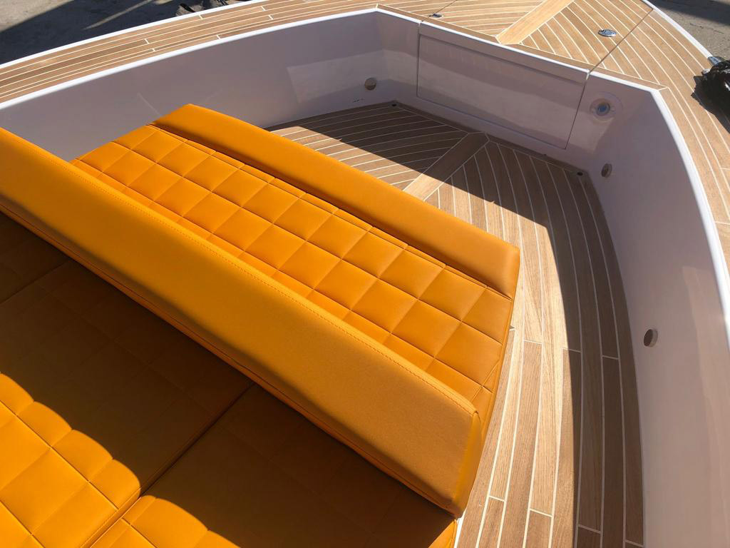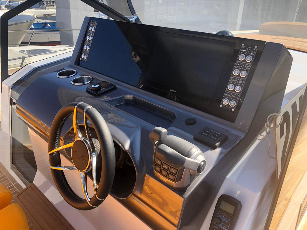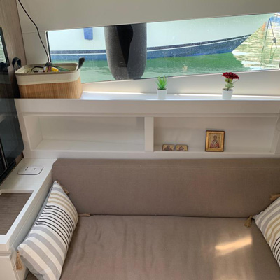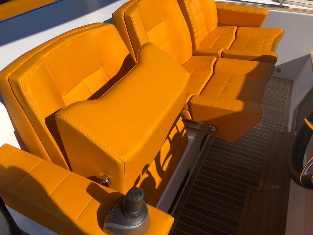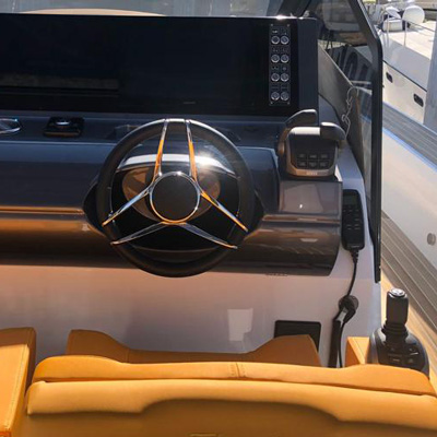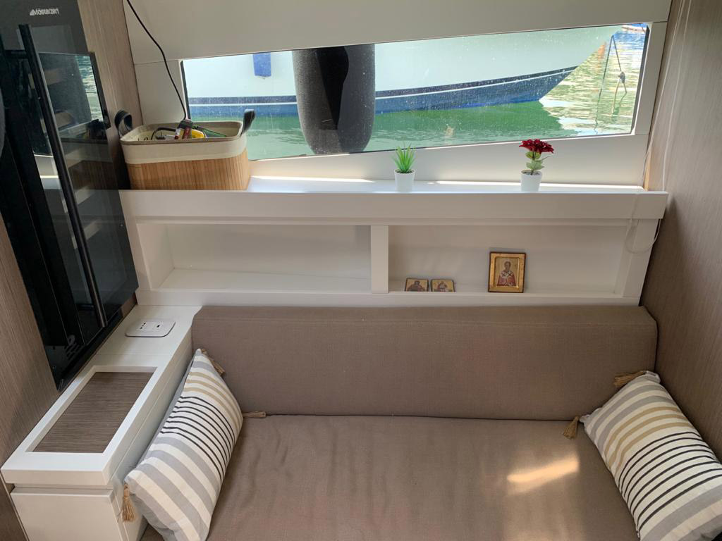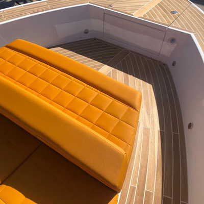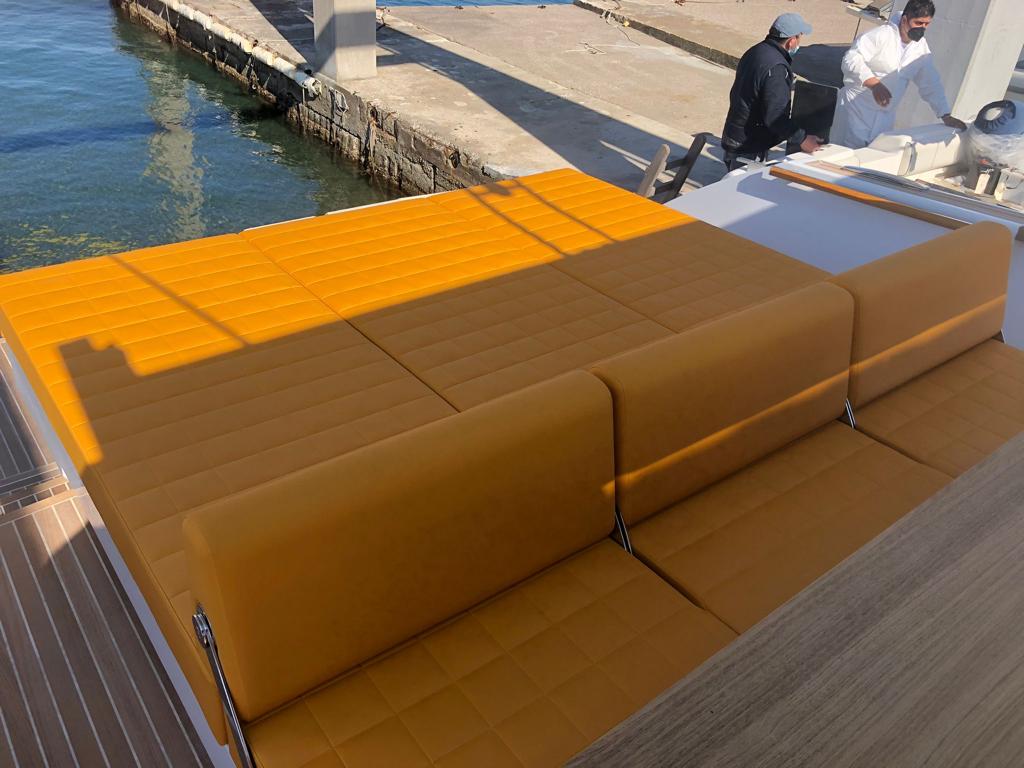 The deck provides in the cockpit area a large sundeck of 230cm x 220cm with a reclining back and a storage compartment that allows you to stow equipment and games (seabob, sup, etc ...) and even a small tender. The sundeck is being completed with a bench in the center of the boat with a reclining backrest and with two tables for the formation of a dining area that can comfortably accommodate 8/10 people seated.