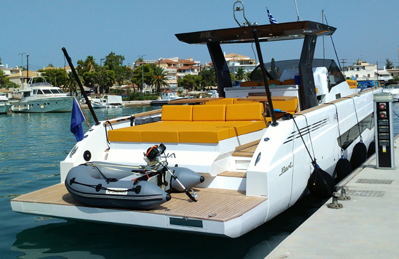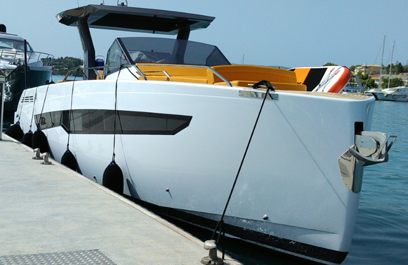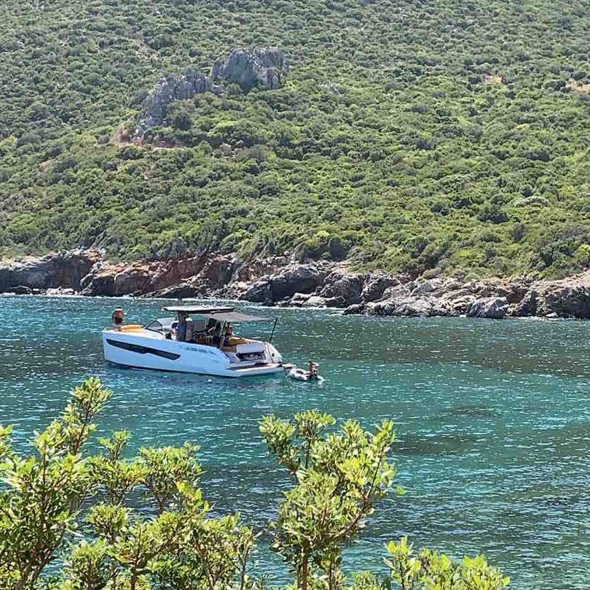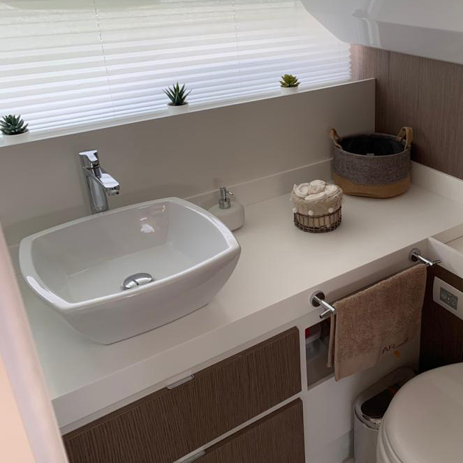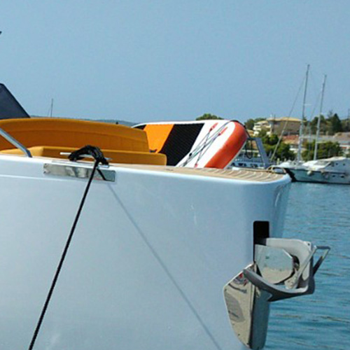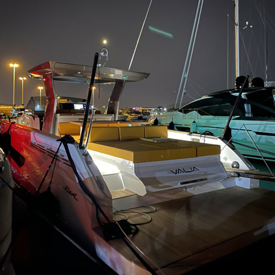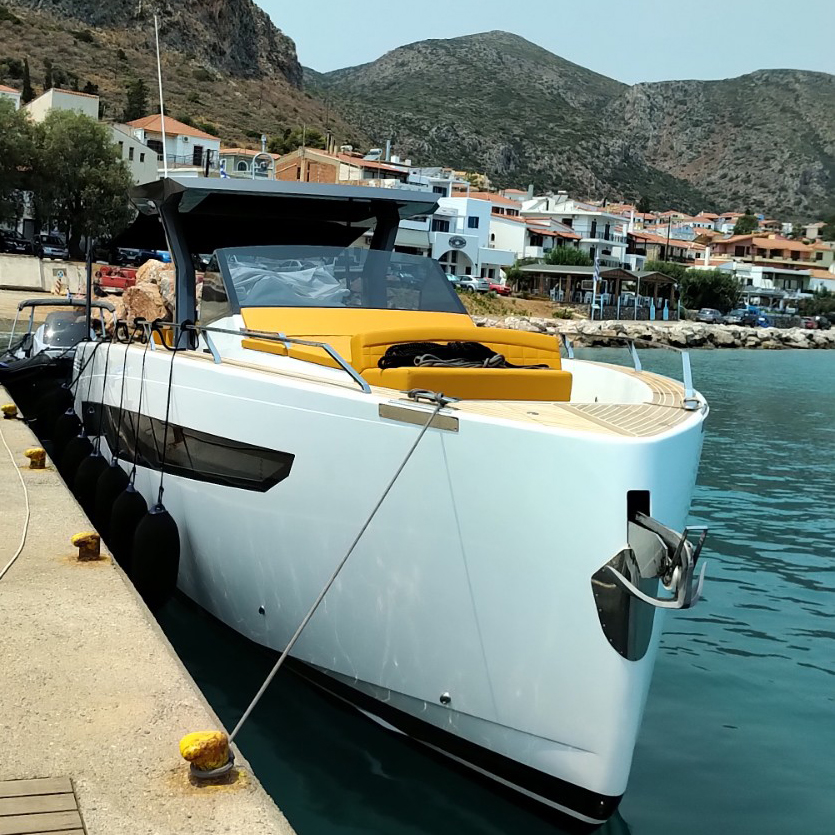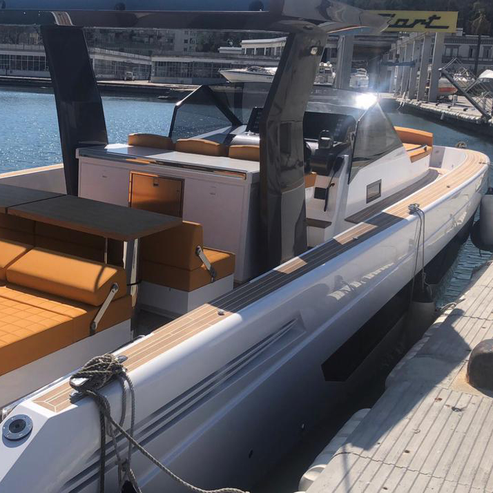The deck provides in the cockpit area a large sundeck of 230cm x 220cm with a reclining back and a storage compartment that allows you to stow equipment and games (seabob, sup, etc ...) and even a small tender. The sundeck is being completed with a bench in the center of the boat with a reclining backrest and with two tables for the formation of a dining area that can comfortably accommodate 8/10 people seated.