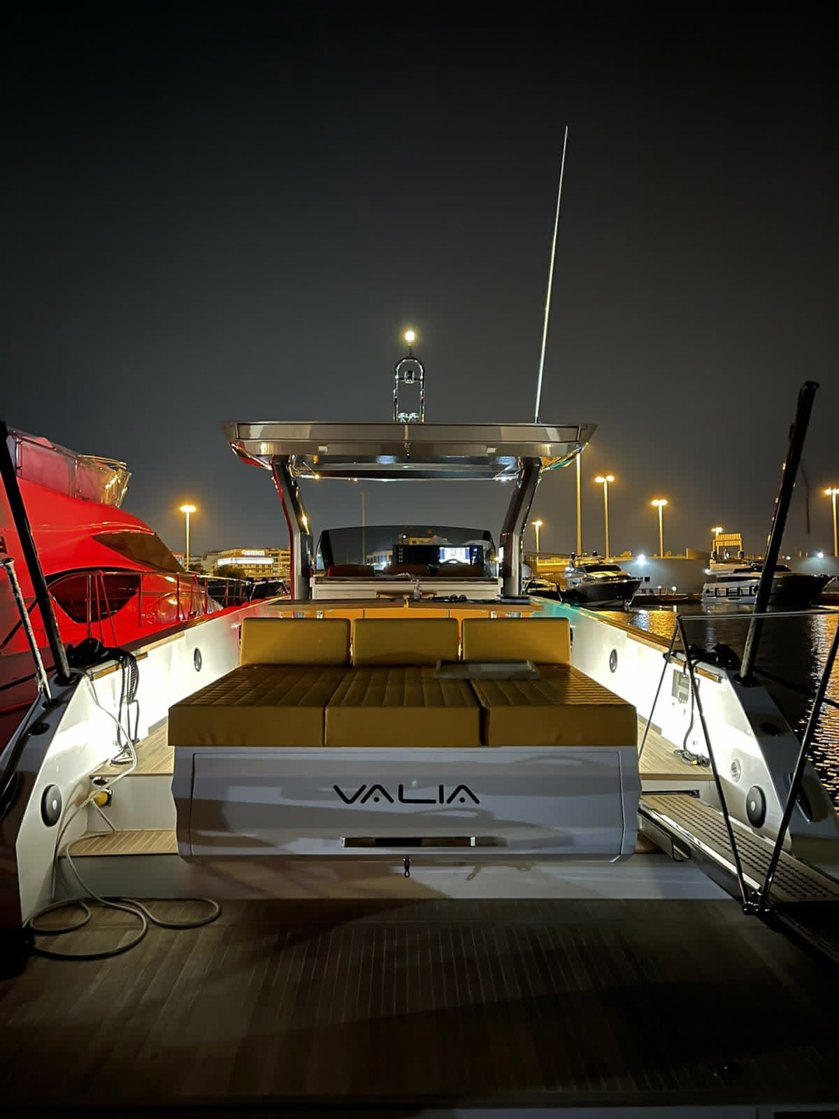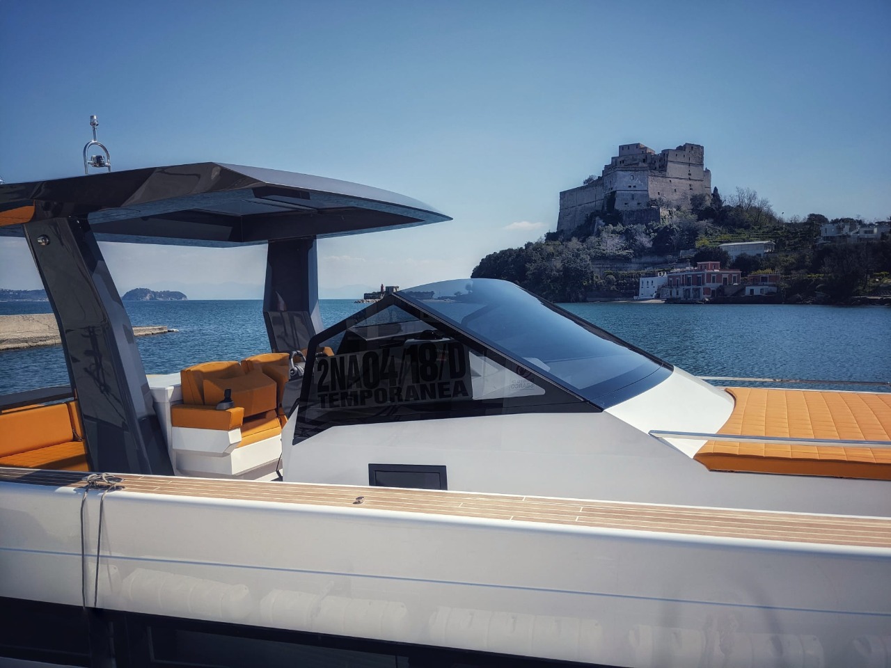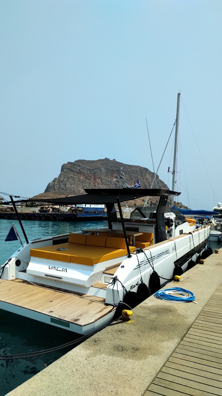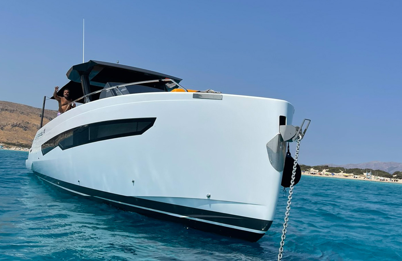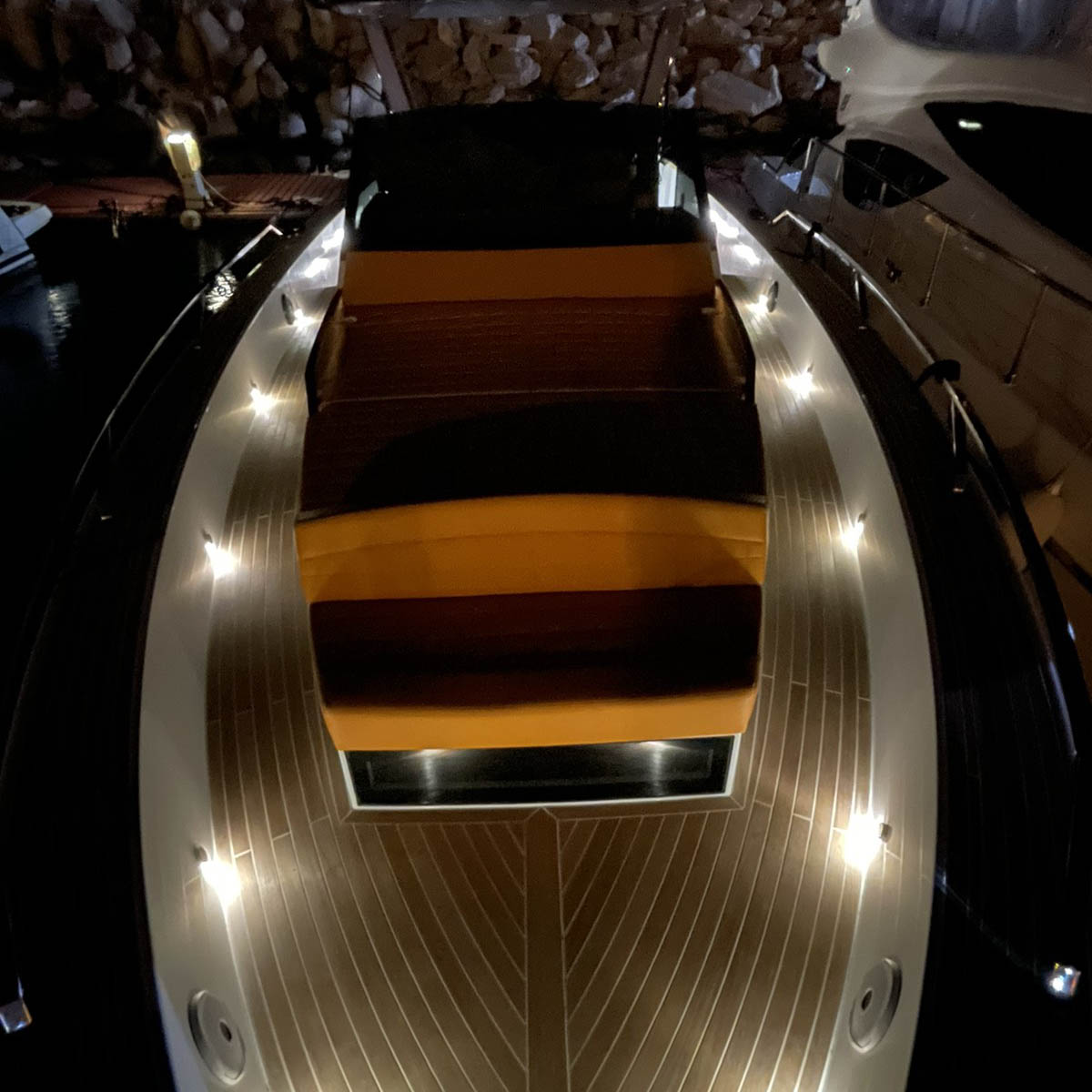 The deck provides in the cockpit area a large sundeck of 230cm x 220cm with a reclining back and a storage compartment that allows you to stow equipment and games (seabob, sup, etc ...) and even a small tender. The sundeck is being completed with a bench in the center of the boat with a reclining backrest and with two tables for the formation of a dining area that can comfortably accommodate 8/10 people seated.
