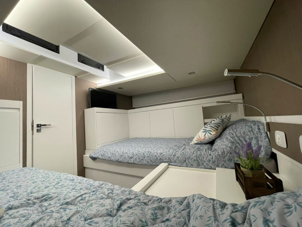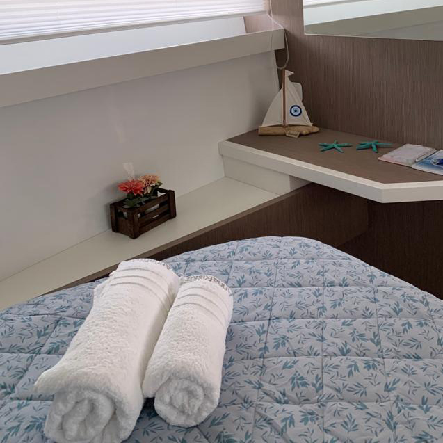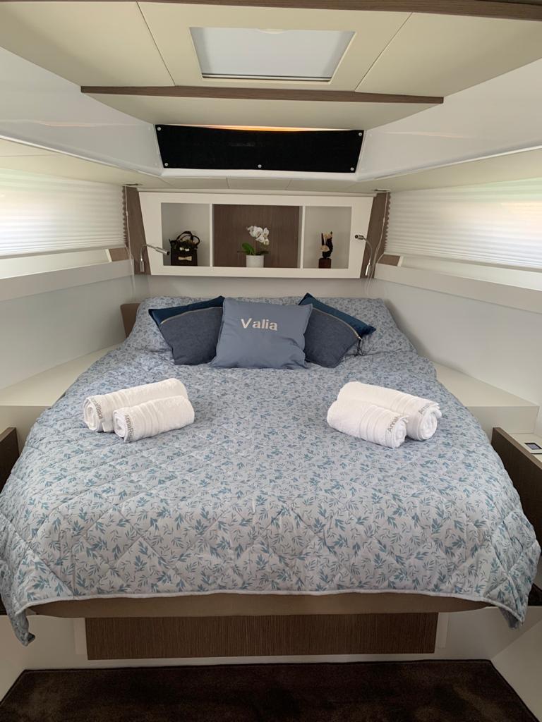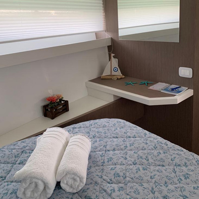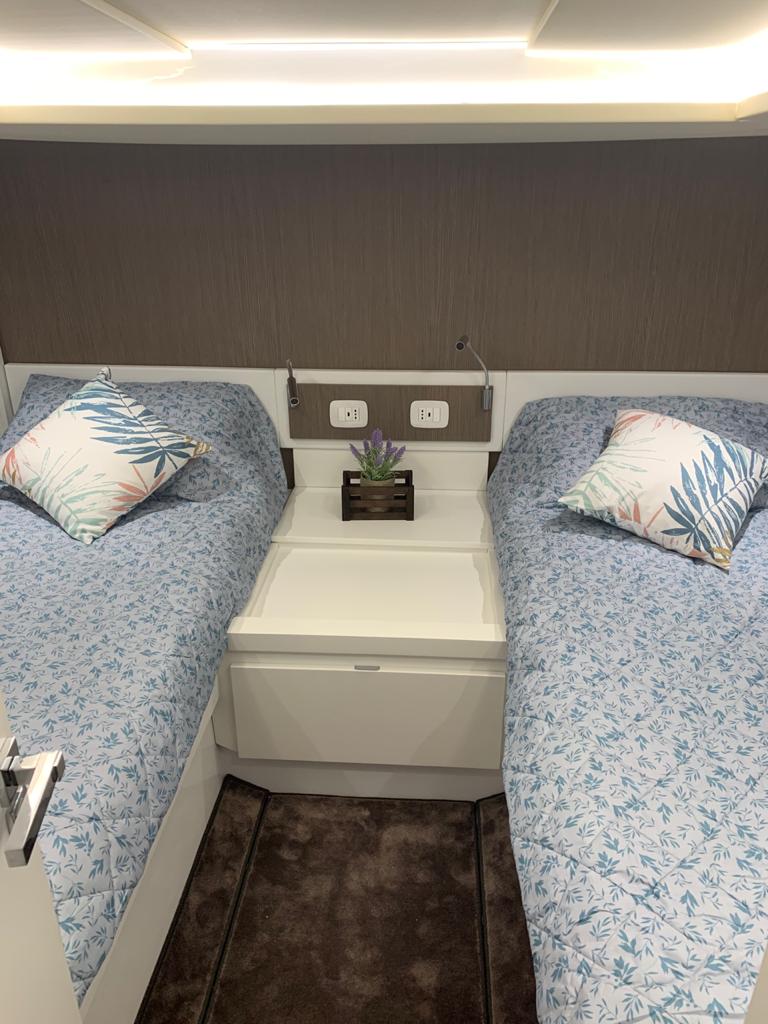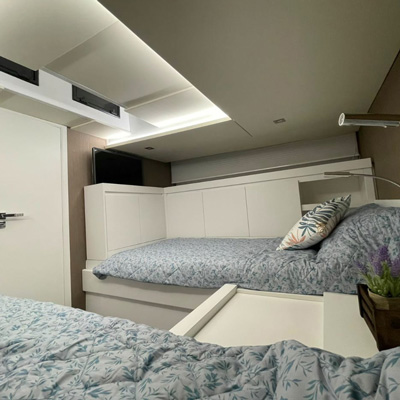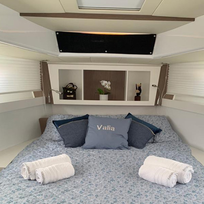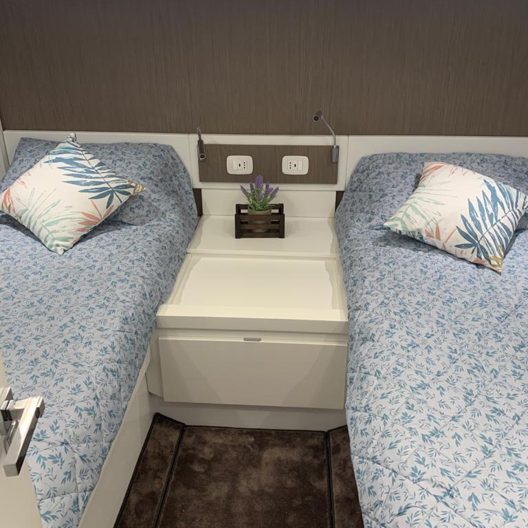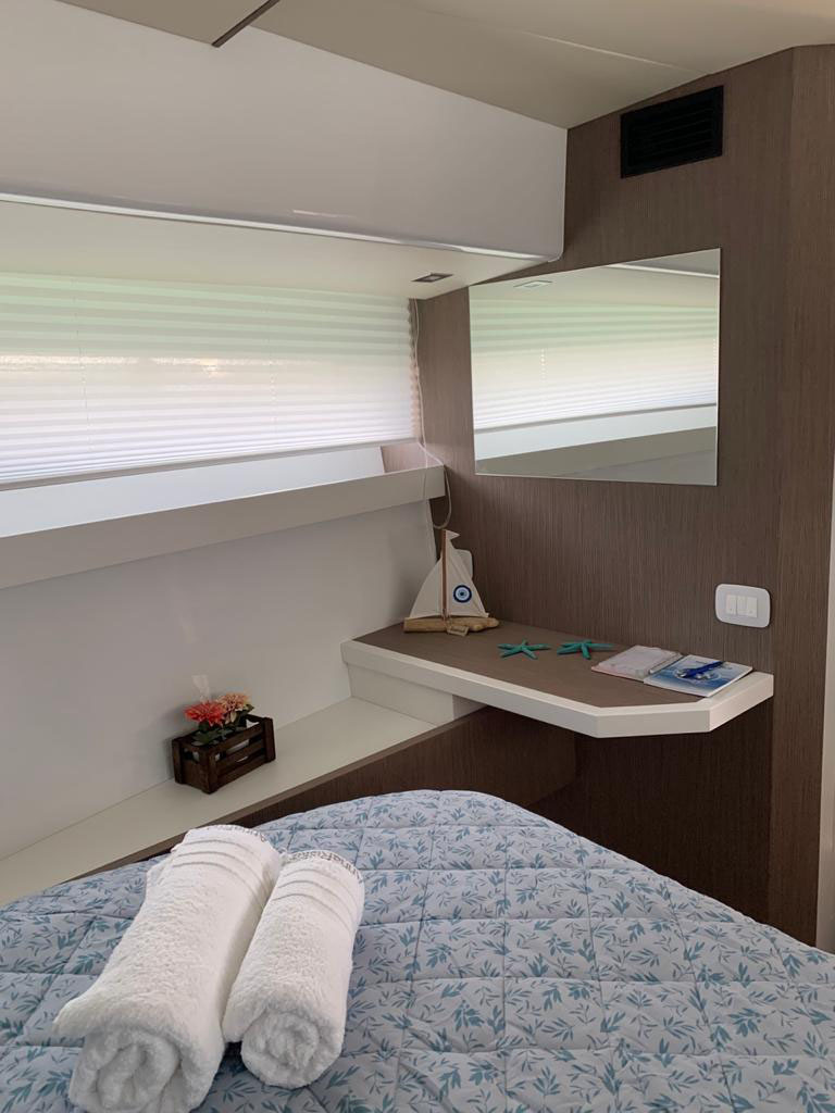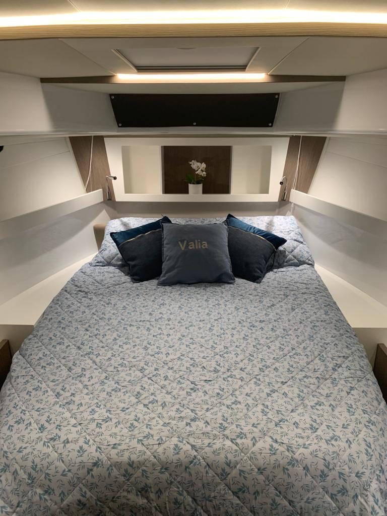 The aft cabin reaches 1.80 m, 30 cm more than other boats of the same type. You can close it with bulkheads and have more privacy. The standard internal layout includes a TV cabinet with boudoir and a full-height wardrobe.