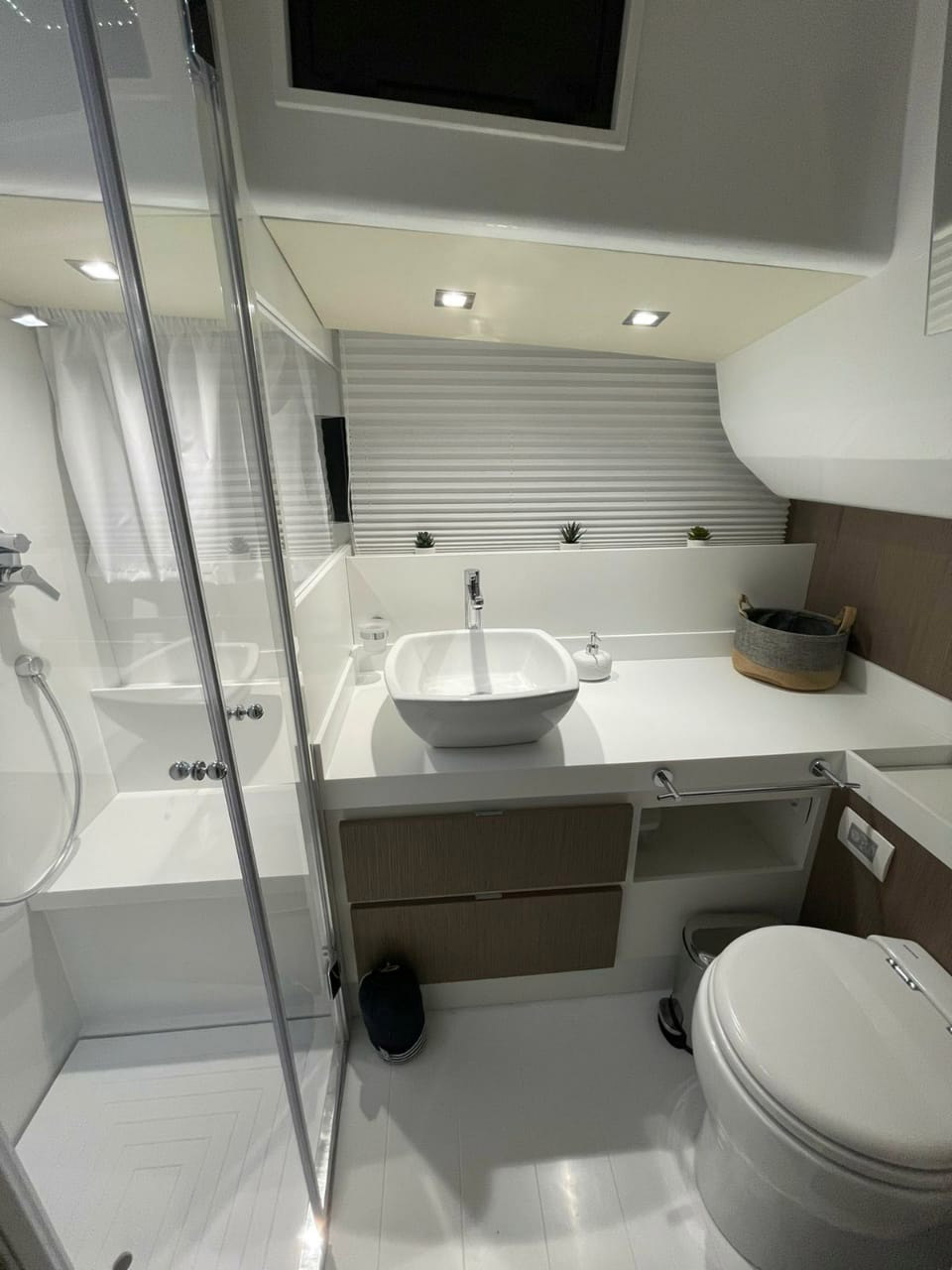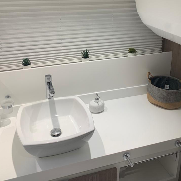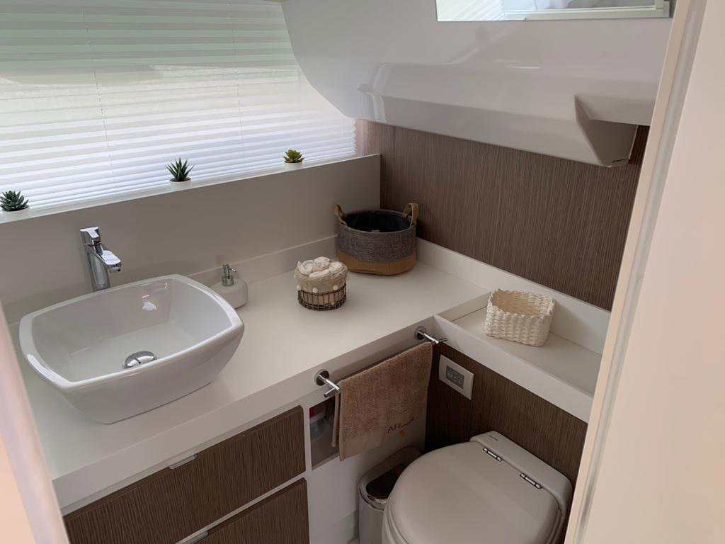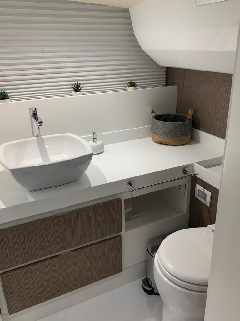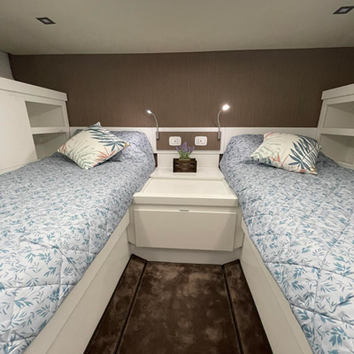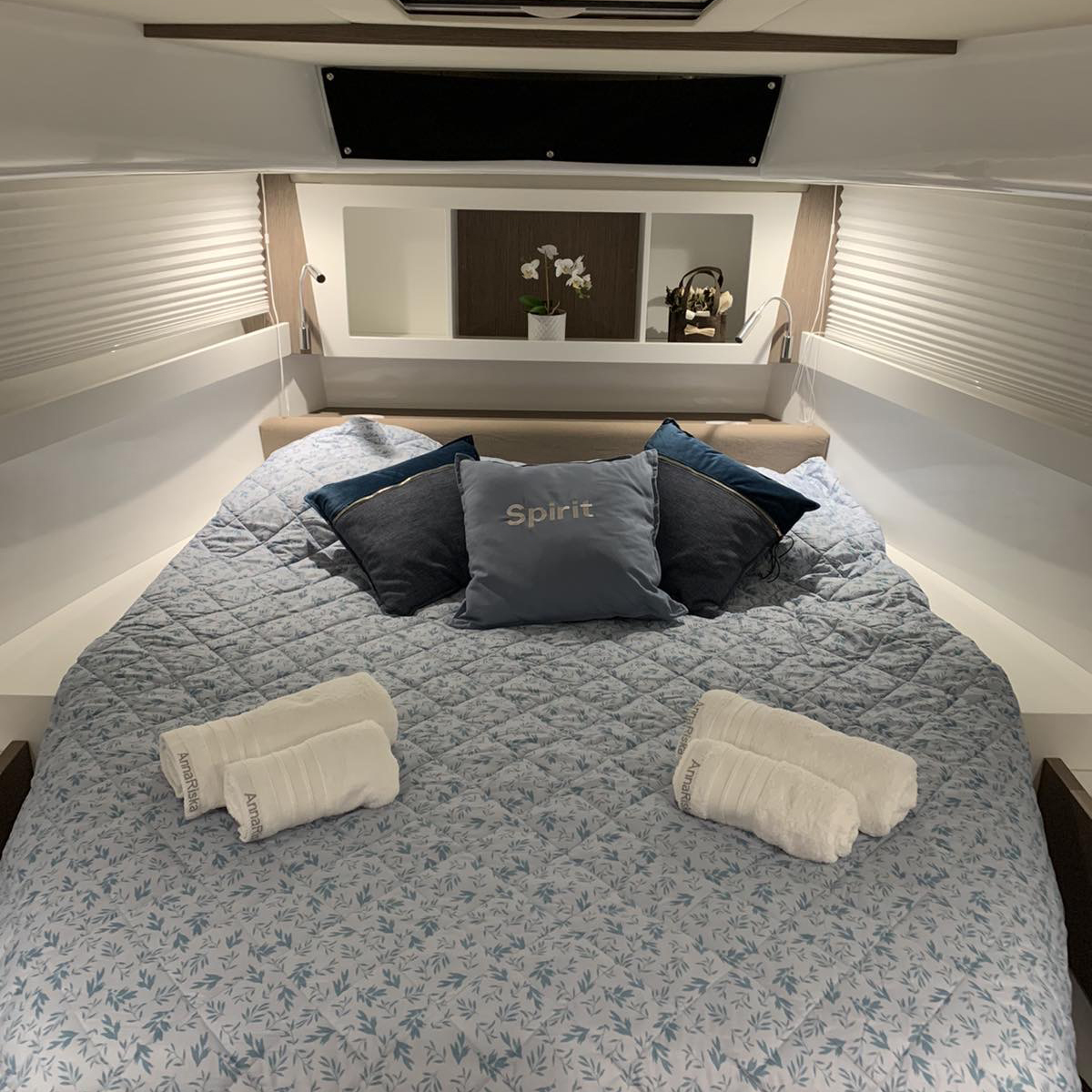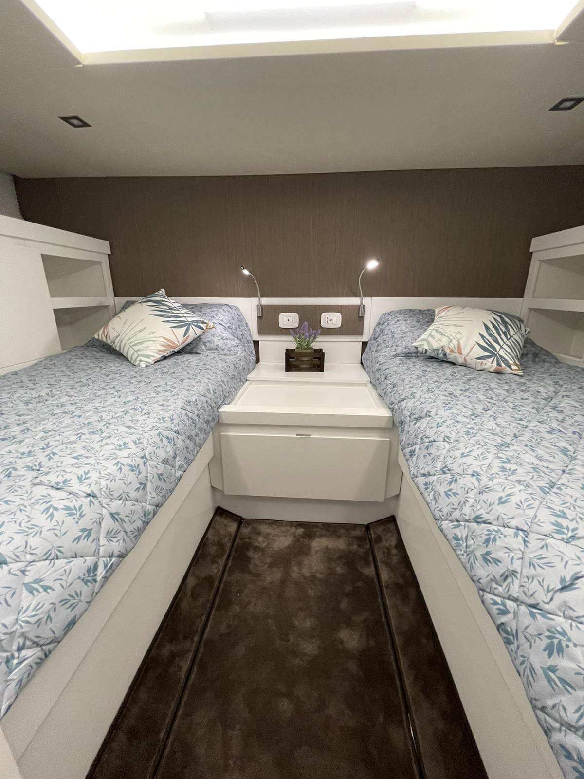 The aft cabin reaches 1.80 m, 30 cm more than other boats of the same type. You can close it with bulkheads and have more privacy. The standard internal layout includes a TV cabinet with boudoir and a full-height wardrobe.